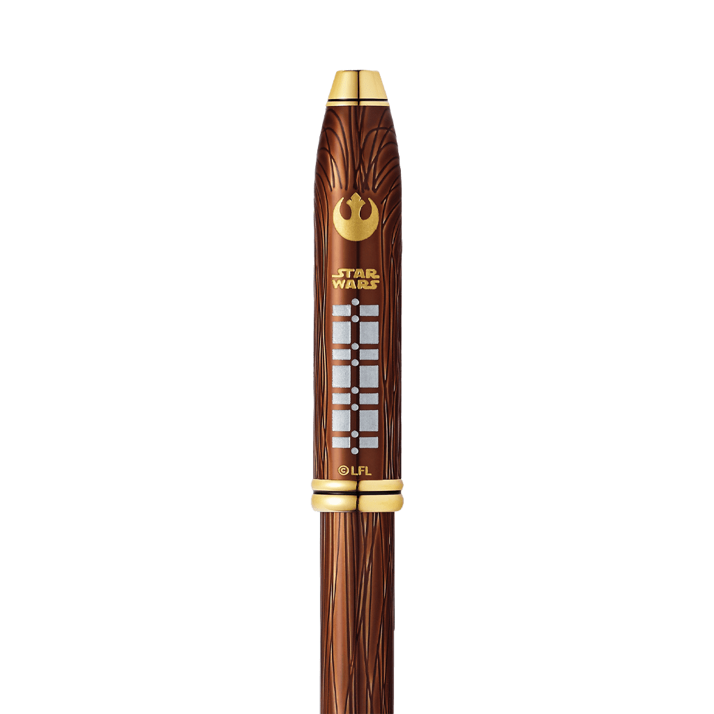روان نویس cross star wars chewbacca قهوهای با توجه به شخصیت CHEWBACCA از کاراکتر های اصلی فیلم star wars الهام گرفته شده است. بدنه این قلم تماماً با حکاکی نقوش پوشیده شده است. تک تک قطعات این روان نویس جذاب، با طلای بیست و سه عیار آبکاری شده است؛ بعلاوه رنگ قهوه ای این روان نویس، خاص بودنش رو دو چنان میکند. از ویژگی های بارز دیگر این روان نویس میتوان به نگین سواروسکی آن اشاره کرد. با ویژگیهای که در بالا گفتیم این محصول در بین خاصترین و ارزشمندترین محصولات قرار میگیرد، به طوری که چشم هر بینندهای را قطعاً به خود خیره خواهد کرد، پس اگر شما به دنبال خاص بودن هستید پیشنهاد میکنیم حتماً به تهیه این روان نویس فکر کنید.